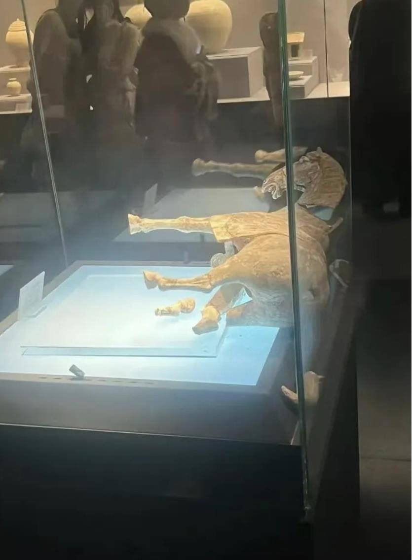 洛阳博物馆内一匹唐代彩绘贴金陶马倒在一旁,马腿断裂 来源:网传截图